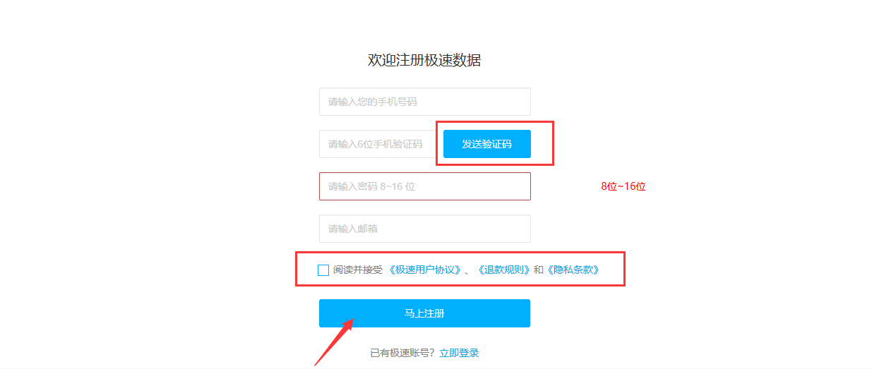 然后在注册的页面填入手机、邮箱等信息,点击"马上注册",即可完成基本注册。